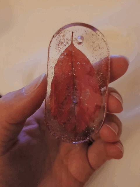 Je m’en rappelle très bien c’était en octobre 2018. Ce mois-là, une de mes très très chères amies est décédée. Lors de son enterrement, une très jolie feuille d’arbre rouge est tombée sur ma tête. Elle était parfaite et je n’ai pas pu m’empêcher de penser que c’était un signe de mon amie. J’ai gardé la feuille et je l’ai posée sur mon bureau. Rapidement, j’ai eu peur qu’elle s’abime et j’ai cherché une solution pour la sauvegarder/pétrifier/figer (si un psy passe par là, y a de quoi dire en lien avec le deuil !). C’est ainsi que j’ai découvert la résine et j’ai coulé ma feuille dans un « gros » bloc. Assez gros pour pouvoir le poser sur mon bureau, assez fin pour le porter en gros bijou si envie. Aujourd’hui, j’ai toujours ce « bloc » sur mon bureau !