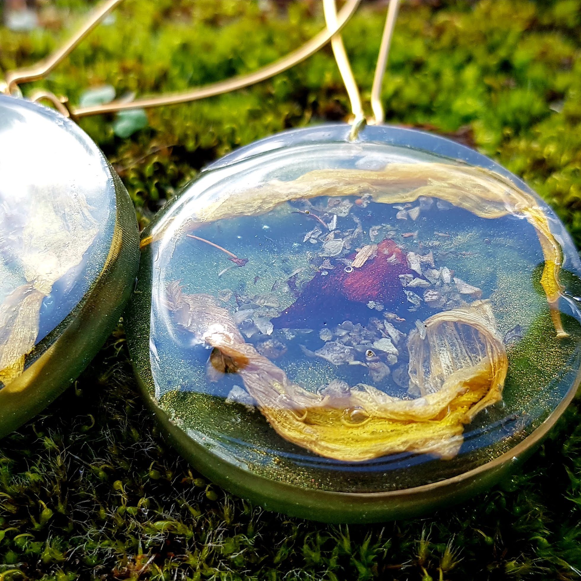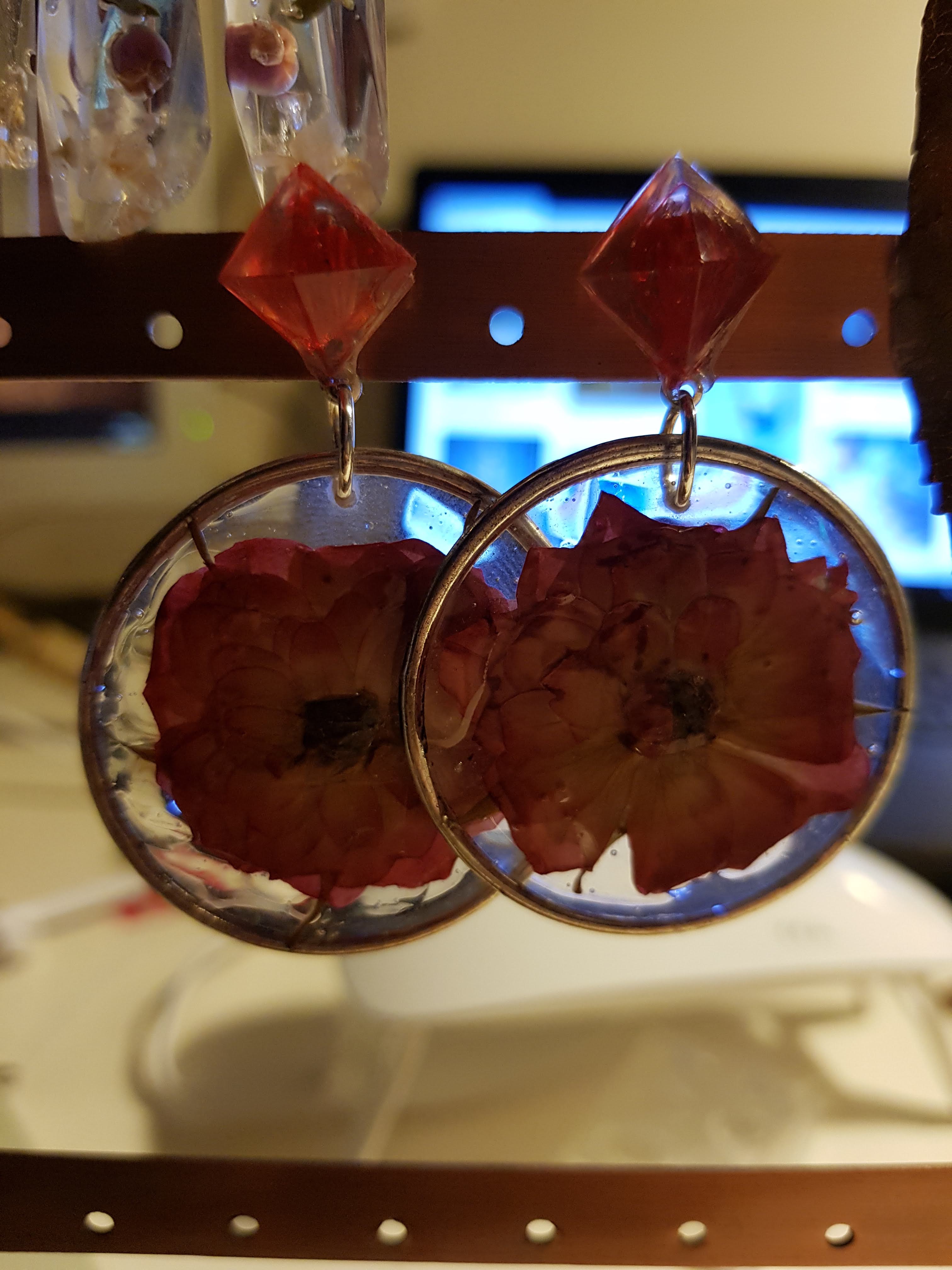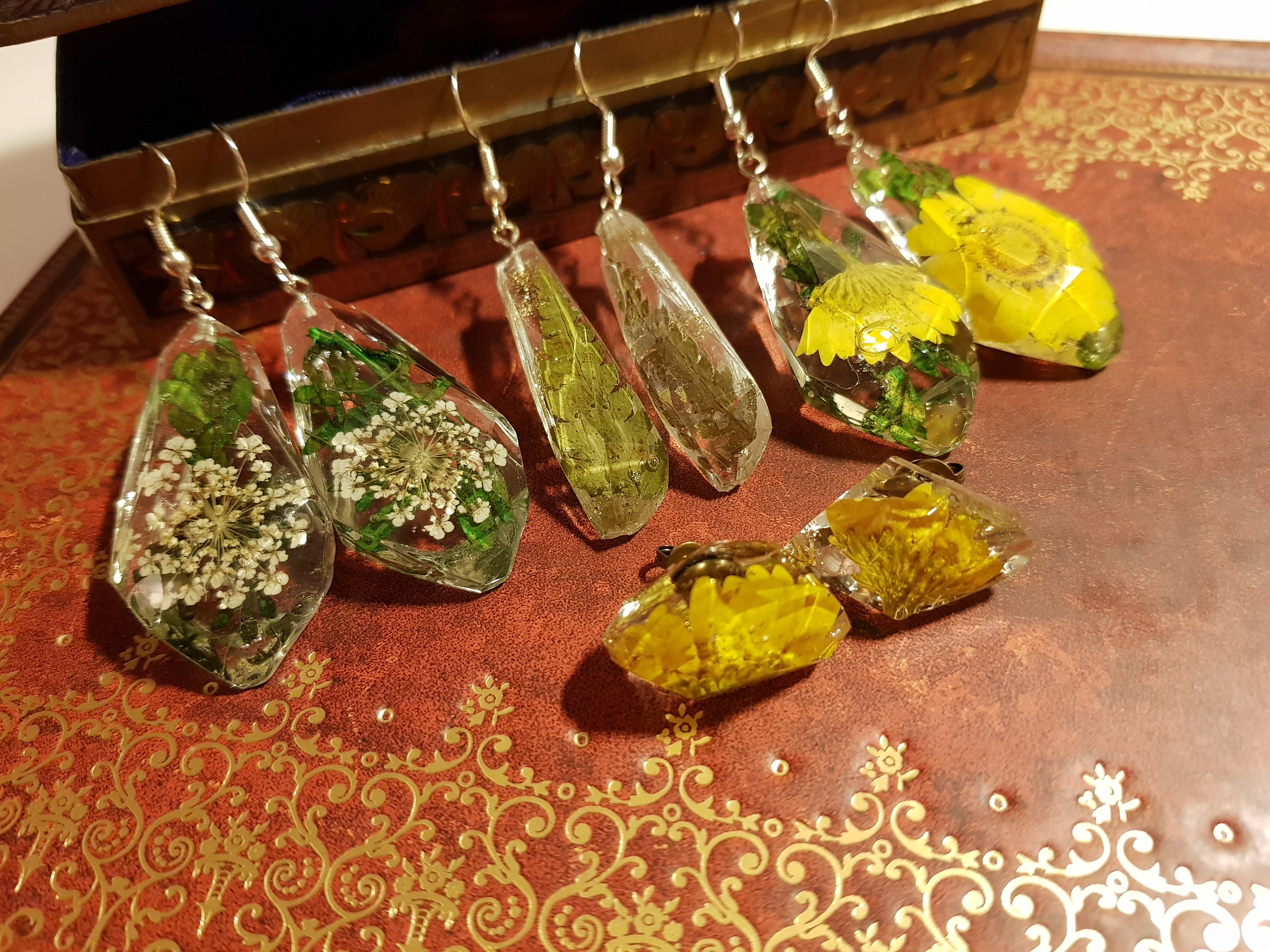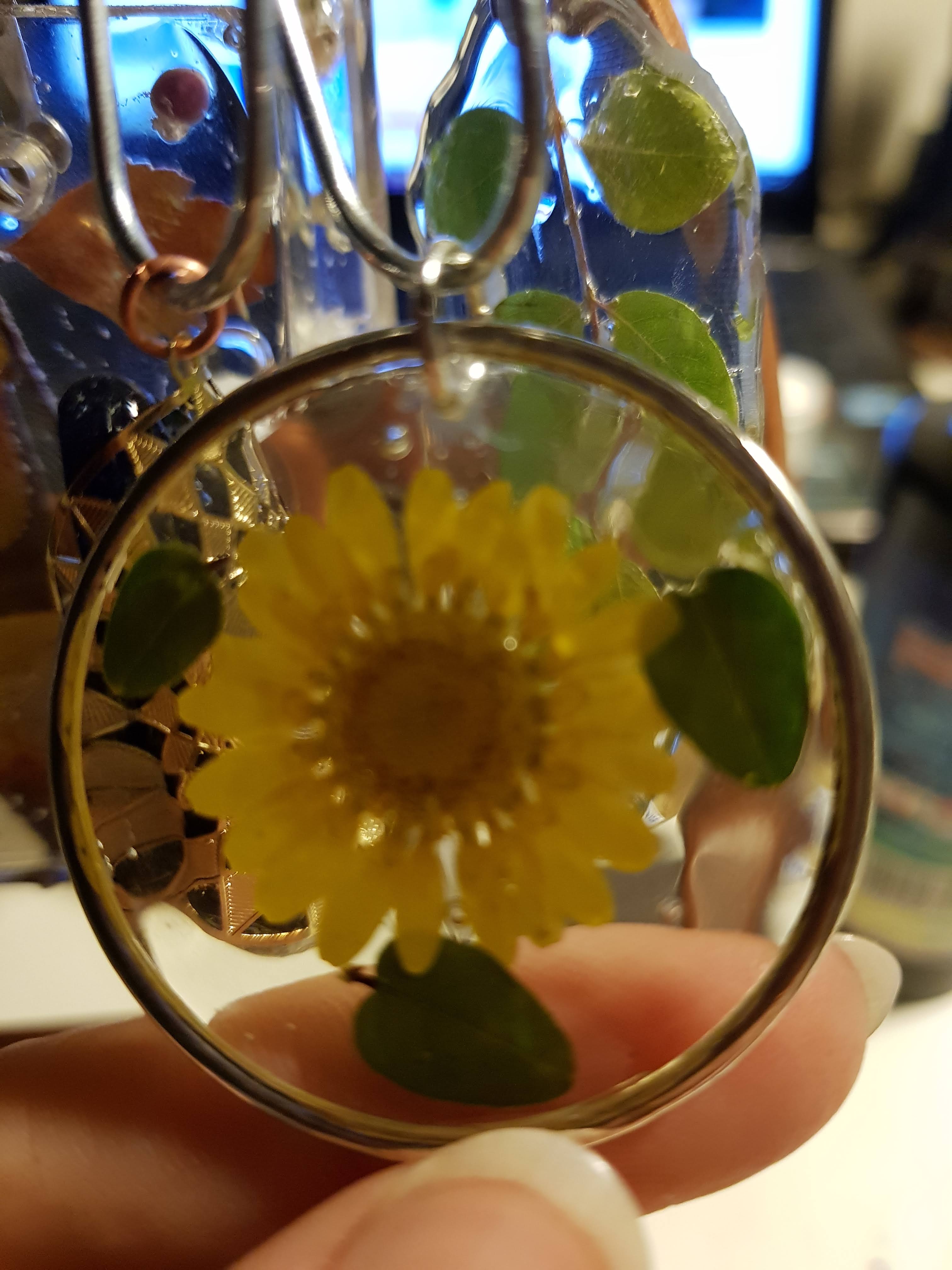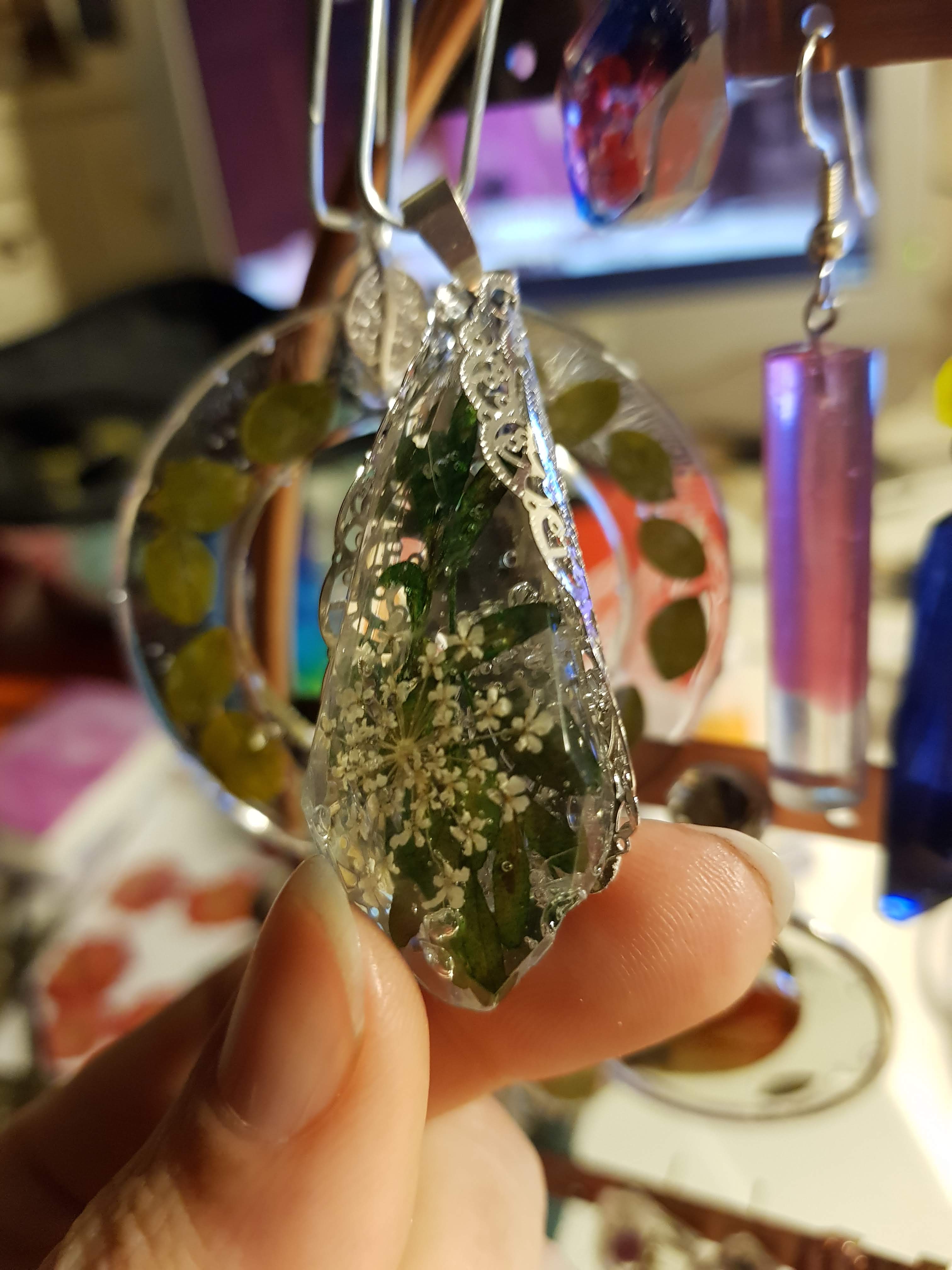 Ma mère fabriquait des bijoux avant moi. Elle faisait importer de magnifiques apprêts en argent de Bali et les montait avant de les vendre. J’ai repris le truc mais je suis la première des deux à avoir tenté le bijou en résine. Toujours en 2018, il a fallu réfléchir aux cadeaux de Noël. Une de mes sœurs a proposé que les cadeaux entre nous ne dépassent pas 5 euros. J’avais la résine, des apprêts, des outils … Manquait plus que des trucs à mettre dedans, de préférence plats, beaux et naturels … Bah oui, suis-je con, des fleurs pressées ! J’ai commandé « juste » ça et ça m’a bien couté moins de 5 euros par bijou, parce que j’ai triché et je n’ai pas compté ce que j’avais déjà. Aujourd’hui c’est différent forcément 😉
